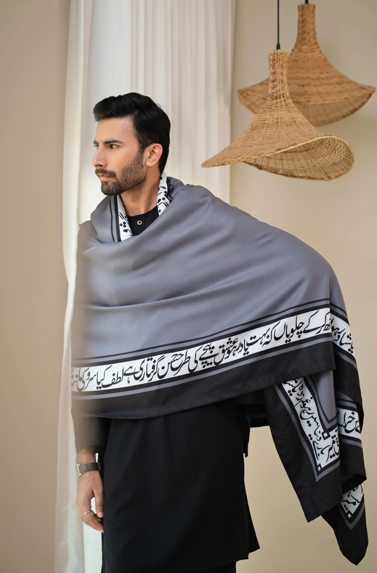 Unisex Double-sided herringbone shawl featuring Urdu calligraphy of Poetry by Mir Taqi Mir. Available in 2 Colors!