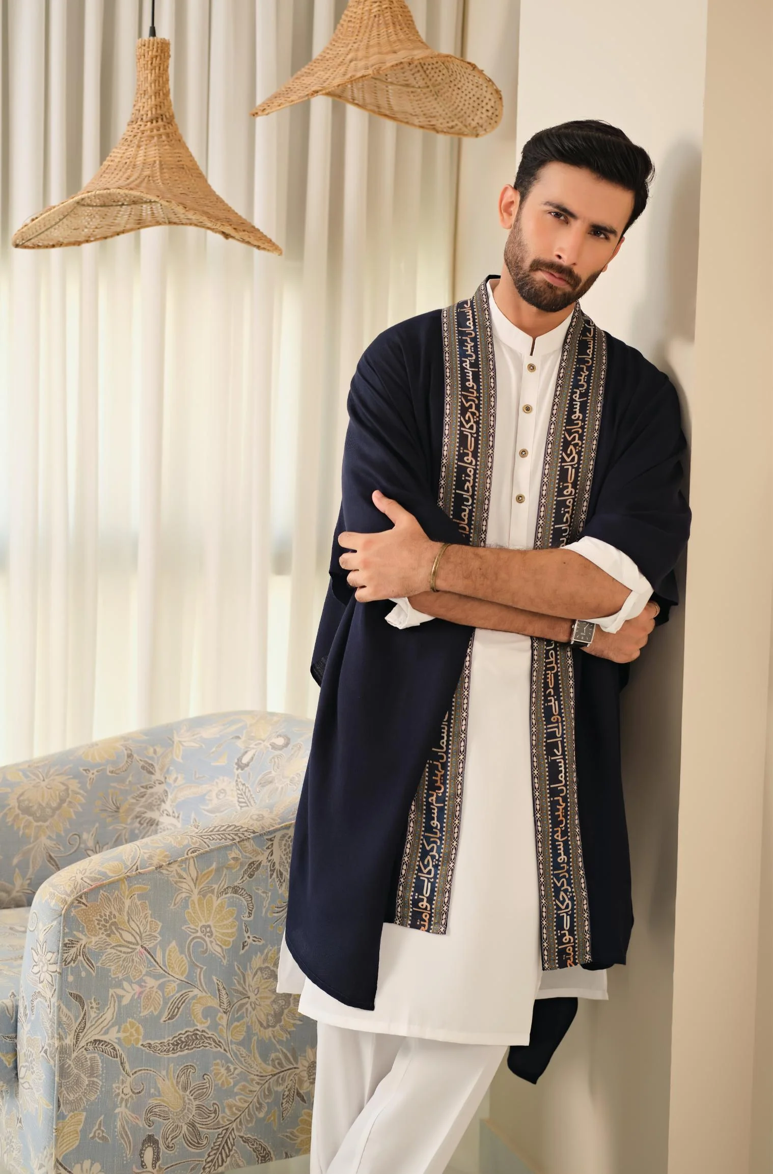 The Sabaat Cape is made using Acrylic Wool. Featuring a wrap-around style, this cape has the words of Allama Iqbal on the borders.